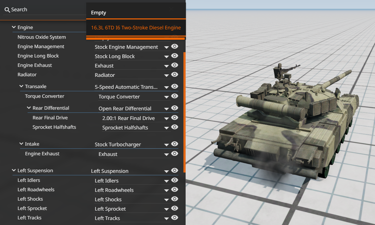 Thanks, it works now! Help, I implemented your Jbeam changes on both tracks and now the tank does a weird sound when driving and also doesn't want to turn, what else should I change to fix it? I separated the suspension components to change it easier, maybe I messed something up there: But it was fine when only the left track was changed, the right one causes problems now --- Post updated --- You completely ruined the torque curve, it has 19 thousand horsepower now, not realistic at all --- Post updated --- Anyway I'm updating this thing and I'll need help with the steering because it stopped working, engine has some more modern stuff now