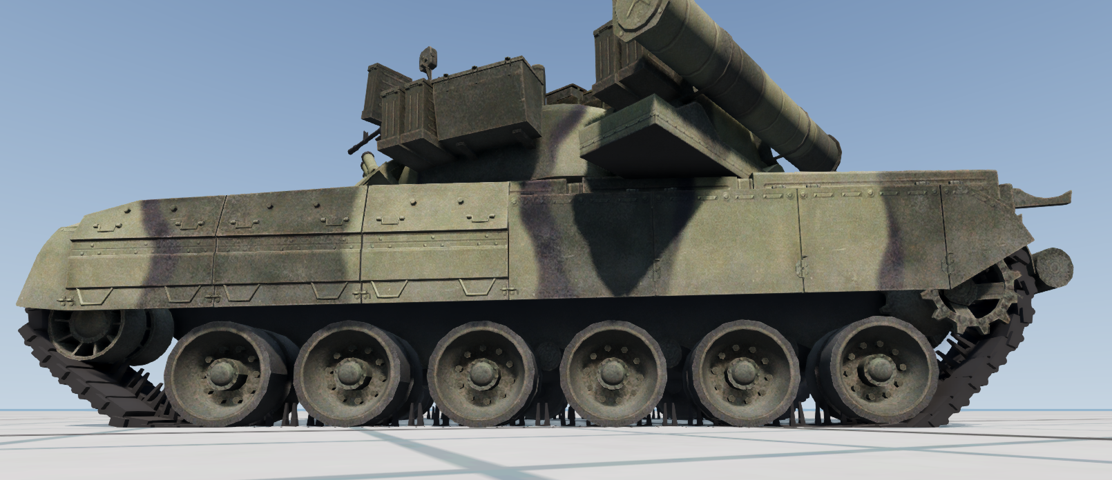 Currently it's a bit lower than it should be because I haven't added in all the parts it needs yet. (The biggest thing is the fuel which has no weight currently but will have a lot.) The weight of the sprockets is also the same as irl, with most of the weight concentrated in the center axis of each sprocket to ensure that as little torque as possible is needed to turn them. I haven't checked the weight of the trakcs yet though, possibly if they are too heavy then the sprocket might struggle to push them at high speed.