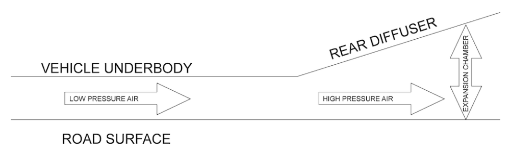This shows basically what a low pressure zone looks like. The particular car in the image has no rear diffuser so its getting lots of drag. The de volente has a large and very effective rear diffuser, to eliminate as much of the low pressure zone as possible. Here's how. air is passing underneath the volente at low pressure. As the air passes to the rear of the vehicle through the diffuser, the air expands through an expansion chamber. Through this expansion, air speed is reduced and pressure is increased (through what is called the Venturi effect). This pressure differential between the low-pressure air under the car and the high pressure at the rear creates a vacuum sucking air out from under the car. With high-pressure air above the car and low pressure under the car, high downforce is created while reducing the low pressure zone. I know this can seem confusing but there you go.