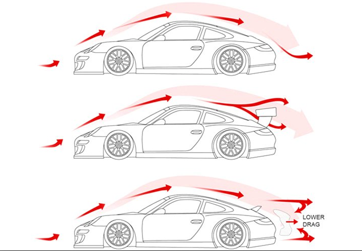 The car on top has no wing, which helps with the rear low pressure zone, but we need down force for stability. The second car shows a large rear wing. The kind you would see on a track oriented car. This wing would generate large amounts of down force, and would make the rear very stable. However not only is the wing itself making too much drag, it's also ignoring the rear low pressure zone. The final car has a smaller wing. as you can see the air is being directed over the wing, while also creating a drag reducing effect on the rear of the car. What we needed for the Volente, was a mixture of cars 1 and 2.