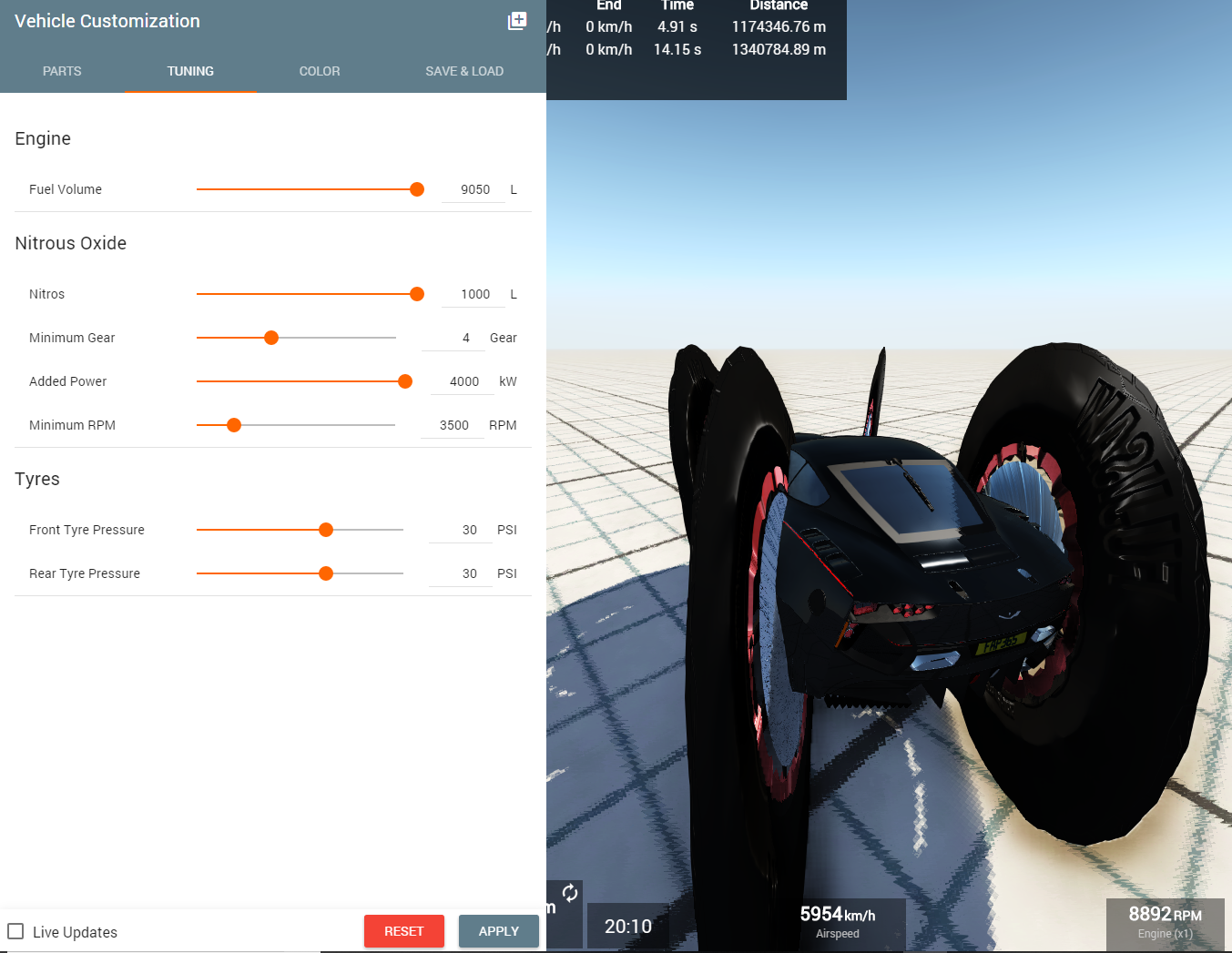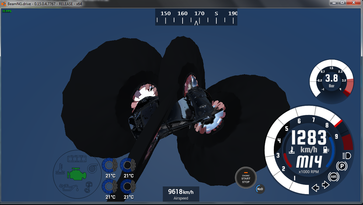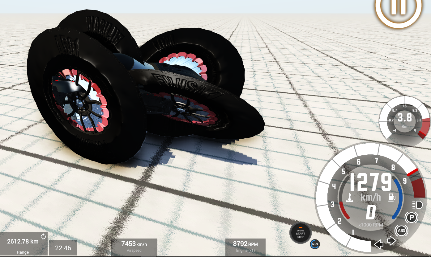 I would just like to add that the fact that anyone can even make a road legal car go anywhere near 1,700 mph is ridiculously impressive. Tires are one of the major reasons real life production cars have not yet achieved 300 mph+. For instance the bugatti chiron has a limited top speed of 261 mph because it's tires could not handle the g -forces. In fact at top speed the edge of the chirons tires are experiencing 3,800 g's. Given that the tires on the deo volente had the same diameter tires as the chiron's and at 1,700 mph, they would be experiencing ~247,509 G's. However they do not have the same diameter at top speed. By my best estimate the tires at top speed have a diameter of 5.5 feet or 1.7 meters. This tire expansion is the line between real life and beamng, because obviously tires on a real car couldn't expand ~2.2 times there own size like that that. Although comical and stupid looking the tire expansion is the only reason this car can reach its top speed. Suspension strength, and tire strength comes in after. now that the tires have expanded, at top speed the car's tires are only experiencing 112,502 G's, which obviously is still a lot and way more than any tire in real life can handle. The only reason these tires can hold that G load is because of Innocentjoker's fantastic work in the Jbeam files of this car, in which the tires have been modified to sustain the extreme forces.