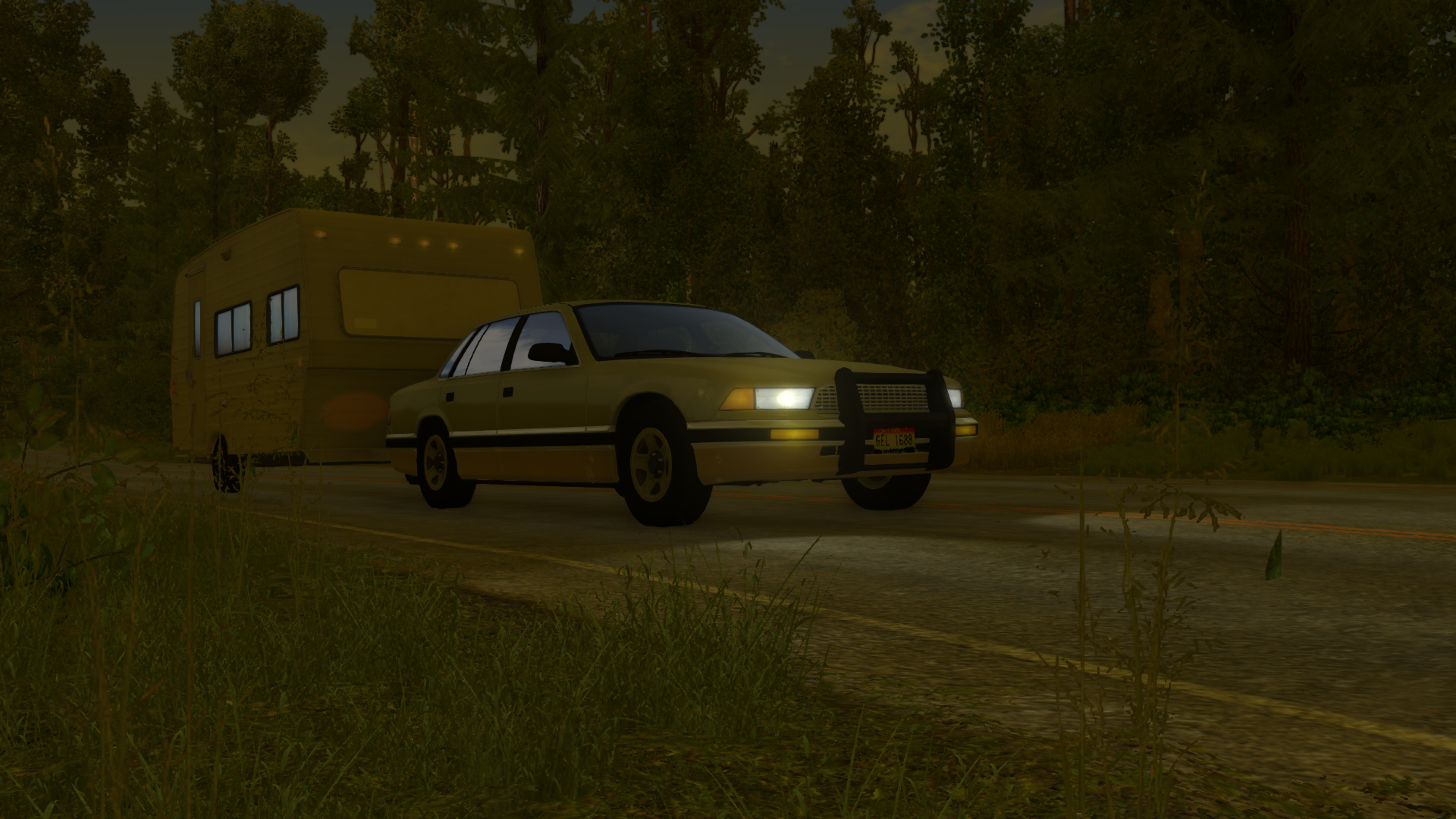 Currently this, my attempt on somewhat "modern" muscle. Equipped with a custom 427 CID V8 producing 481 HP @ 6500 RPM, 620 Nm @ 3800 RPM 6 speed manual trans, 3.8:1 LSD Top speed of 189 MPH @ 6500 RPM 5th gear, 6th for OD High performance radiator 255/40 R18 front, 275/40 R18 rear with heavy Duty suspension & brakes setup Oxnitron Electronic Stability Control & Traction Control System Stiffened chassis (invisible roll cage to stimulate it) Quick ratio steering rack + Sport steering wheel This big boy sure handles well.